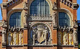 - Dem Wappen, welches sich in der Mitte der Hauptfassade befindet: Es ist eine Weiterentwicklung des ursprünglichen Wappens des alten Hospital de la Santa Creu, das den gleichen ikonographischen Leitlinien folgt, mit den Unterschieden, dass das alte Wappen nicht gekrönt war und die Engel, die es flankierten, knieten. Das Wappen ist das Werk von Eusebi Arnau und erscheint in einem Kreis vor blau-gelbem Mosaik, das das Himmelsgewölbe darstellt, unter einem Blendbogen. Der reich dekorierte Schild mit seinen Kreuzen und Pfählen vor goldenem Grund hebt sich davon deutlich ab, ebenso die königliche Krone und die Schildhalter, die rechts Äskulap mit Stock und Schlange und links Hippokrates, der als Vater der Medizin das Buch des Lebens trägt, darstellen. Sie stehen auf zwei Säulen, die die Achsen der Welt darstellen[14].