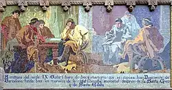 Die beiden letzten Paneele 15 und 16 wurden erst 1923 von Lluís Bru i Salelles geschaffen, die zeichnerischen Vorlagen für alle sechzehn Mosaike lieferte Francesc Labarta i Planas.