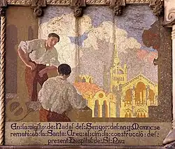 Die Verwendung von Mosaiken innerhalb des modernistischen Baukomplexes ist viel bescheidener als in anderen von Domènech i Montaner entworfenen Gebäuden, wie dem Palau de la Música Catalana. Die Mosaiken sind das Werk von Mario Maragliano i Navone, der mit Domènech bereits 1902–1905 am Casa Lleó Morera und am Seminario Mayor in Comillas zusammengearbeitet hatte. Maragliano arbeitete zwischen 1907 und 1911 am Hospitalkomplex mit[16].