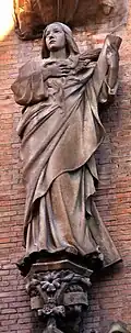 - Den stehenden Engeln, die sich unter je einem Baldachin an den vier Pilastern seitlich der Schutzpatrone bzw. schräg oberhalb des Wappens befinden und den ikonografischen Schatz dieser Ebene beschützen. Auch sie sind das Werk von Pablo Gargallo Catalán, obwohl sie einen menschenähnlicheren Stil zeigen als diejenigen im Erdgeschoss[15].