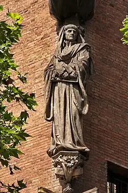 An den beiden Seitenflügeln des Verwaltungsgebäudes befinden sich im Umfeld der oben beschriebenen sechzehn Mosaikpaneele unter Baldachinen zehn jeweils 2 Meter große Skulpturen ohne identifizierende Inschriften. Ihre Auswahl wurde von Domènech getroffen. Es handelt sich dabei um Figuren der katalanischen Geschichte sowie zwei weibliche Heilige. Am linken Seitenflügel sind dies: