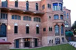 Der zentrale Körper der Hauptfassade ist wie ein Altarretabel in drei vertikale Züge strukturiert, die in drei Stockwerken jeweils von vier Pilastern begrenzt werden. Im ersten Geschoss sind diese aus Stein, in den beiden oberen aus Ziegeln. Auf der unteren Ebene befinden sich drei Zugangstüren, deren Portale mit Archivolten überwölbt sind, die Medaillons aus blau-weißen Fliesen tragen, in denen sich vier Elemente wiederholen: die Initialen „P“ und „G“ des Stifters, ein Tatzenkreuz als Symbol des bisherigen Hospitals und die Pfähle aus dem Stadtwappen Barcelonas. Diese ikonografischen Elemente wiederholen sich auch an verschiedenen Stellen der Einfriedung. Solche blau-weißen Fliesen wurden von Domènech i Montaner auch an der Casa Thomas (1895–1998), in der Fonda España (1898–1903)[12] und im Seminario Mayor von Comillas (vor 1904) häufig verwendet.