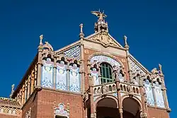 - fünf Paneele am Operationspavillon. Die Figuren der Heiligen Kosmas und Damian befinden sich an den Fenstern der Hauptfassade. Die drei Marienmosaiken, die die Seiten- und Rückansicht schmücken, wurden bereits erwähnt. Dazu kommen zwei dreiteilige Mosaike mit Darstellungen von Sant Martí und Sant Jordi, den Schutzpatronen des mittelalterlichen und des heutigen Kataloniens, mit heraldischer Symbolik an ihren Seiten über zwei Fenstern an der rückwärtigen Fassade des Verwaltungsgebäudes.