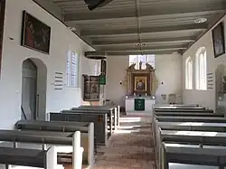 Der Innenraum wurde längst mit einer Holzbalkendecke überspannt. Die Kirchenausstattung stammt aus dem 17. Jahrhundert. Zu ihr gehört ein Tafelbild, auf dem die Himmelfahrt Christi dargestellt ist.