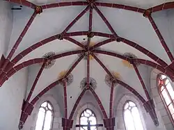Das Bauwerk ist aus Backstein mit gleich breitem dreiseitig geschlossenem Chor ausgeführt und wird von einem Dachreiter akzentuiert. Das Äußere wird durch Strebepfeiler und zweibahnige Fenster mit Fischblasenmaßwerk bestimmt. Im Süden erschließt ein spitzbogiges, stabwerkgerahmtes Porphyrportal das Bauwerk, an der Nordseite des Chores ist die Sakristei angefügt. Das Schiff ist dreijochig, ein Chorbogen mit aufgemalter Quaderung vermittelt zum zweijochigen Chor. Das Schiff ist mit einem farbig gefassten, engmaschigen Netzgewölbe geschlossen, im Chor ist ein Sterngewölbe eingezogen, dessen Schnittpunkte mit Flammen und Strahlen bemalt sind. Die Schlusssteine und Rippenanfänger sind mit farbig gefassten Wappen aus Blech versehen. In der Wand ist eine flachbogige, tiefe Sakramentsnische eingelassen. Im Westen ist eine eingeschossige Steinempore eingefügt, die von einem Mittelpfeiler gestützt wird. An der Emporenbrüstung ist ein Bilderzyklus mit Themen der Barmherzigkeit aus dem Matthäusevangelium zu sehen, der von Jugendstilornamenten gerahmt wird und von Weßner-Collenberg aus Basel im Jahr 1909 geschaffen wurde. Die kreuzrippengewölbte Sakristei ist an ihrer Pforte mit aufgemaltem Stabwerk geschmückt und enthält ein Weihwasserbecken.