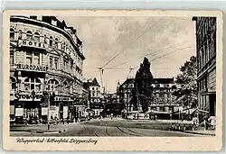 Blick von der Alten Freiheit zum Elberfelder Bahnhof von 1935, wie er sich dem Betrachter bis 1943 bot. Auf der rechten Seite das Hotel Europäischer Hof -