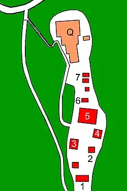 Im Norden der Anlage befindet sich das große Gästehaus für Pilger (Q).