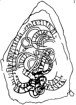 Die Ritzung im Schlangenband[1] erfolgte in einen grauen Granitfelsen. Der Block ist 2,75 m breit, 1,4 m dick und mittig 1,4 m hoch. Bereits im 17. Jahrhundert fehlten einige der Runen und die Verzierung am rechten Rand. Um das Jahr 1065 wurde der Felsblock an der damals etwa 2,0 m höher anstehenden Wasserlinie des verkehrsreichen Hafens platziert, so dass jeder, der auf dem Seeweg kam, die Inschrift sah.
