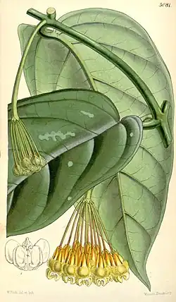 Hoya lasiantha, Blütenstand und Blätter (aus Curtis Botanical Magazine, Vol. 84 (1858), Taf.5081[1]) | ||||||||||||