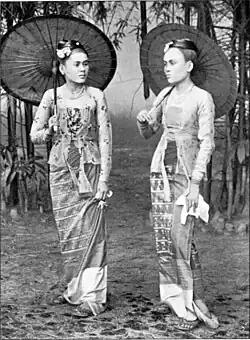 - ↑ Vincenzo Sangermano: A Description of the Burmese Empire. Oriental Translation Fund of Great Britain and Ireland, 1833, S. 123 (google.de [abgerufen am 1. Mai 2024] Original „The dress of the women is also a piece of striped cotton or silk, of a square, or nearly square form, which they tie round the middle, and the unmarried girls fold it over the bosom. It is open in front; so that in walking, the legs and part of the thigh are exposed.“).