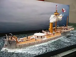 Anders als im Modell dargestellt und obwohl der Turm um 360° drehbar war, feuerte Grau stets nur nach Steuerbord, weil das Schiff mit nach Backbord geschwenktem Turm aufgrund eines Konstruktionsfehlers an Stabilität verlor.[5]