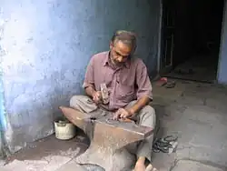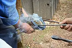 Das Hufeisen wird der Unterseite des Hufes aufgelegt und bei Bedarf mittels Hammer auf dem Amboss zugerichtet (geschmiedet), um es dem Huf in Breite und Form exakt anzupassen. Die Formung des Hufeisens kann in warmem oder kaltem Zustand erfolgen.