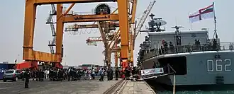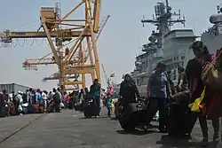 Die saudisch geführte Militärkoalition verhängte maritime Kontrollen in Form einer Seeblockade, die verhinderte, dass Importe den Jemen erreichten.[100] Der Jemen bezog vor der Krise 90 % der Lebensmittel durch Importe.[15] In der Folge fielen die Importe auf 15 % des Vorkrisenniveaus.[100][131] Außerdem wurden durch die saudische Militärkoalition Wareneingangskontrollen zu Land und aus der Luft verhängt und damit Hilfslieferungen verhindert.
