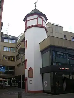 Vom Druckhaus ist heute nur noch der Treppenturm aus dem Jahr 1584 erhalten.