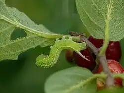 Die Raupen erreichen eine Körperlänge von 35 bis 40 Millimetern. Sie sind nach dem Schlüpfen etwa drei Millimeter lang und haben eine hellgelbliche Färbung. Ältere Raupen sind kräftig hellgrün gefärbt und tragen beidseits des Rückens eine helle Längslinie. Die gesamte Körperoberfläche ist sehr rau und mit zahlreichen kleinen hellen Punktwarzen bedeckt. Die Bauchseite der Tiere ist deutlich abgesetzt dunkelbraun gefärbt. Gelegentlich treten auch komplett braun oder golden gefärbte Raupen auf. Um die Stigmen befindet sich bei ausgewachsenen Tieren je ein rötlicher Fleck. Das Analhorn ist zunächst dunkel, später an der Basis rötlich und zur Spitze hin bräunlich gefärbt.