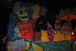 Ein Wagen bei Mardi Gras, der die Leistung der Pioniere beim Bau von Dämmen kritisiert