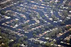 Die Überflutung von weiten Teilen New Orleans wurde nicht nur als Naturereignis diskutiert, sondern auch als Resultat politischer Fehleinschätzungen durch die US-Regierungen. Das Magazin National Geographic warnte bereits im Herbst 2004 in einem Artikel vor einer Katastrophe.[39][40] Der Wissenschaftler R. Burby zeigte anhand dieses Falles das „Safe-Development-Paradox“ auf. In den 1960–1970er Jahren wurden Feuchtgebiete im Umfeld von New Orleans durch Deiche geschützt und damit erst die Bebauung ermöglicht. In diesen Gebieten entstanden während des Hurrikans die größten Schäden.[41]