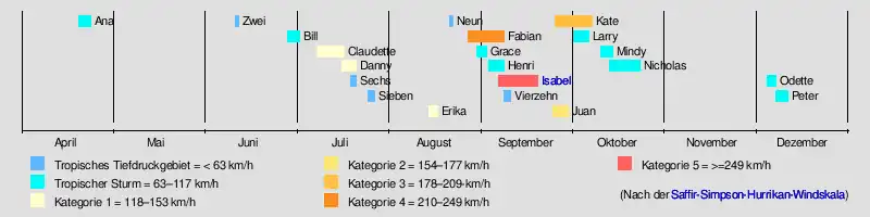 Insgesamt entstanden 21 tropische Tiefdruckgebiete, 16 Tropische Stürme und sieben Hurrikane, von denen sich drei zu schweren Hurrikanen der Kategorie drei oder hoher entwickelten. Der stärkste Sturm des Jahres war Hurrikan Isabel; er erreichte die fünfte Kategorie der Saffir-Simpson-Hurrikan-Windskala und verursachte 3,6 Milliarden Dollar Sachschäden, 51 Menschen verloren durch diesen Hurrikan ihr Leben.
