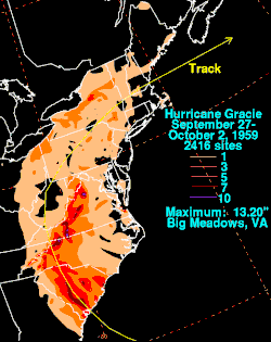 Heftiger Regen fiel ein gutes Stück vor dem Sturm entlang eines inversen Trogs, der sich nördlich des Sturmes erstreckte. Vom Vormittag des 28. September bis zum Vormittag des 29. Septembers wurden in Norfolk, Virginia 172 mm Niederschlag gemessen.[17] Die höchste in Verbindung mit Gracie beobachtete Niederschlagsmenge wurde mit 335 mm aus Big Meadows gemeldet.[18] Der Sturm löste insgesamt sieben Tornados aus.[19] Einige davon, die den sich auflösenden Sturm durch Virginia begleiteten, töteten zwölf Personen bei Charlottesville, Virginia. Andere Tornados gingen in der Carolinastaaten und Pennsylvania nieder.[20] Für den Großteil des durch die Auswirkungen Gracies betroffenen Gebietes war der Regen von Vorteil, da die Region vor der Ankunft des Wirbelsturms unter einer Dürre litt.[21]