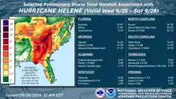 Helene verursachte großflächige Schäden durch Sturmfluten an der Küste, durch Sturm sowie im Binnenland durch teils sturzflutartiges Hochwasser, das durch starke, teils extreme Niederschläge verursacht wurde. Zudem bildeten sich zwischen 25. und 27. September mindestens 21 Tornados, hinzu kamen weitere bei Regen- und Gewitterereignissen, die Helene vorausgingen.[27] Bereits vor Eintreffen des eigentlichen Hurrikans kam es in den Appalachen zu länger andauerndem Regen, wodurch die Böden sehr schnell kein Wasser mehr aufnehmen konnten.[28]