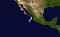 Kurz darauf erreichte Madeline mit Windspitzen um 140 km/h etwa 150 km südwestlich of San Blas seine größte Stärke. Der Hurrikan behielt während der nächsten achtzehn Stunden seine Spitzenstärke bei und schlug in dieser Zeit eine Kurve nach Nordwesten ein.[1] Durch das Vorhandensein einer südlichen Windscherung bestand am 19. Oktober nur ein kleines Gebiet mit starker Gewittertätigkeit, und das System begann, auf den Satellitenbildern schlecht auszusehen.[9] Im Tagesverlauf schwächte sich der Hurrikan zum tropischen Sturm ab.[1] Um 14:00 Uhr UTC hatte der Sturm wegen starker Windscherung seine Konvektion vollständig eingebüßt.[10] Am 19. Oktober um 17:00 Uhr UTC wurde der Sturm zum tropischen Tiefdruckgebiet abgestuft, das nur noch aus einem Wirbel niedrigliegender Wolken auf dem halben Weg zwischen der Südspitze Niederkaliforniens und dem mexikanischen Festland bestand. Am 20. Oktober gegen 6:00 Uhr UTC hatte sich Madeline vollständig aufgelöst.[1]