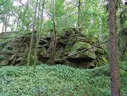 Blöcke aus Granodiorit, die vereinzelt weit aus dem Boden ragen, liegen verstreut und in sehr unterschiedlicher Dichte umher. In manchen Bereichen fehlen sie vollständig. Ein ca. 4 m hoher und etwa 10 m langer Klippengrat krönt den Gipfel, der auch als Hutstein bezeichnet wird. Südlich und südöstlich davon liegen zahlreiche Gesteinsblöcke, deren Kanten im Unterschied zu den sonstigen Blöcken bemerkenswert frisch verwittert und eckig aussehen. Granodiorit steht in dem aufgelassenen Steinbruch westlich des Gipfels an.
