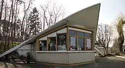 - Neben der Hyparschale hat Müther noch zwei weitere Schalenbauwerke in Templin entworfen: einen Kiosk am Templiner See (1969) und eine Reparatur- und Fahrzeughalle der Uckermärkischen Verkehrsgesellschaft (UVG) nordwestlich der Altstadt (1973), die heute noch in Nutzung sind. Das Dach der Halle verläuft in 5 × 2 trichterförmigen Stützsäulen (Schirmschalen) nach unten und ist daher nur von innen zu sehen. Zwischen den Schirmschalen sind konvex gewölbte Fensterbänder, die Tageslicht von oben hereinlassen.[45] Die Halle ist Müthers einziger Industriebau.[46] Das Gebäude in der Hans-Philipp-Straße 2 wurde vom Brandenburgischen Landesamt für Denkmalpflege (BLDAM) ebenso unter Denkmalschutz gestellt.[47]