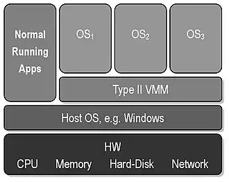 • Ein Typ-2-Hypervisor (hosted) setzt auf einem vollwertigen Betriebssystem auf dem Hostsystem auf und nutzt die Gerätetreiber des Betriebssystems, um auf die Hardware des Hostsystems zuzugreifen. Typ-2-Hypervisoren sind daher auf allen Hostsystemen lauffähig, auf denen vom Hypervisor unterstützte Hostbetriebssysteme lauffähig sind.