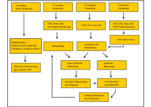 Ein alleiniger Nachweis erniedrigter T4-Konzentrationen ist zur Diagnose ungeeignet, insbesondere wenn es keine klinischen Anzeichen für eine Hypothyreose gibt. In diesem Fall sollten eventuell verabreichte Medikamente geprüft und ein Euthyroid-Sick-Syndrom in Betracht gezogen werden, der Hund in der Folgezeit auf das Eintreten von Hypothyreose-Anzeichen überwacht und dann erneut getestet werden.[43] Abgeschlagenheit, Gewichtszunahme, Hautveränderungen und Schwäche verbunden mit erhöhten Blutfetten und Cholesterin und erniedrigtem T4 ist bereits stark hinweisend für eine Hypothyreose. Ist T4 im fraglichen Bereich, sollten fT4 und TSH sowie Tg-Autoantikörper bestimmt werden.[34][43] Leider führt auch dies nicht immer zu eindeutigen Resultaten. Wie dann weiter verfahren wird, hängt vom klinischen Schweregrad der Erkrankung ab. Bei milder Symptomatik werden die Tests ohne Behandlung in drei bis sechs Monaten wiederholt.[41] Da die Auswertung der Schilddrüsenfunktionstests nicht immer einfach und eindeutig ist, gilt die Hypothyreose als eine der am meisten überdiagnostizierten Erkrankungen.[26][44] In einer Studie aus dem Jahr 2024 an 102 Hunden mit der Diagnose Schilddrüsenunterfunktion durch den Haustierarzt hielten Spezialisten nur bei etwa der Hälfte der Fälle eine Behandlung für sinnvoll.[45] Nur bei ausgeprägten klinischen Symptomen sollte mit einer versuchsweisen („diagnostischen“) Therapie begonnen werden. Verbessert sich das klinische Bild unter einer solchen Therapie, ist das immer noch kein Beweis für eine Hypothyreose, denn dies kann auch durch unspezifische anabole Effekte des zur Behandlung eingesetzten Levothyroxins bedingt sein. Daher sollte die Behandlung nach Abklingen der Symptome langsam abgesetzt werden (Ausschleichung). Treten dann die Symptome wieder auf, ist eine Hypothyreose sehr wahrscheinlich. Wird ein schilddrüsengesunder (euthyreoter) Hund längere Zeit mit Schilddrüsenhormonen behandelt, so wird durch die negative Rückkopplung die TSH-Sekretion unterdrückt und die Schilddrüse bildet sich zurück. Auch nach Absetzen der Behandlung können bei diesen Tieren die Schilddrüsenhormonspiegel für bis zu einem Monat unter den Normalwerten liegen.[41]