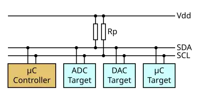 Im Diagramm rechts sind drei Geräte eingezeichnet. I²C benötigt zwei Signalleitungen: Takt- (SCL = Serial Clock) und Datenleitung (SDA = Serial Data). Beide liegen mit den Pull-up-Widerständen RP an der Versorgungsspannung VDD. Sämtliche daran angeschlossene Geräte haben Open-Collector-Ausgänge, was zusammen mit den Pull-up-Widerständen eine Wired-AND-Schaltung ergibt. Der High-Pegel soll mindestens 0,7 × VDD betragen, und der Low-Pegel soll bei höchstens 0,3 × VDD liegen. Die im Bild nicht eingezeichneten Serienwiderstände RS an den Eingängen der Geräte sind optional und werden als Schutzwiderstände verwendet. Der I²C-Bus arbeitet mit positiver Logik, d. h. ein High-Pegel auf der Datenleitung entspricht einer logischen „1“, der Low-Pegel einer „0“.