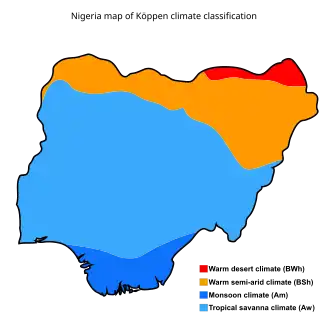 In Nordnigeria herrscht Wüstenklima mit höheren Temperaturen und weniger Niederschlag als im Süden. Im Norden des Landes fallen zwischen 400 und 600 mm Niederschlag, in der Regenzeit des westafrikanischen Monsuns. Südlich der Sahelzone schließt sich die Savannenlandschaft des Sudans an, in der jährlich zwischen 600 und 1600 mm Niederschlag fallen.
