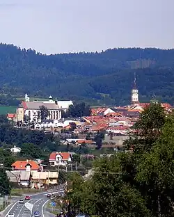Bei Štrba erreicht die Straße seinen höchsten Punkt (um 900 m n.m.) und tritt die historische Zips an, erst durch die moderne Stadt Svit und dann das alte Poprad am gleichnamigen Fluss. Sie verlässt dann das Popradtal und geht durch eine hügelige Landschaft des Talkessels Hornádska kotlina, der Gemeinde Spišský Štvrtok vorbei und durch das historische Levoča. Nach etwa weiteren 15 km geht sie der mittelalterlichen Stadt Spišské Podhradie mit großer Zipser Burg vorbei.