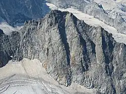 | III. Hornspitze (Berliner Spitze) von Westen aus gesehen mit Normalweg, rechts daneben II. Hornspitze, vorn das Hornkees, hinten links das Schwarzensteinkees; Gletscherstand August 2022 | ||