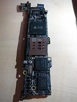 Das iPhone 5 wurde am 12. September 2012 vorgestellt. Der Bildschirm wurde vergrößert, trotzdem ist es dünner und leichter als der Vorgänger. Als SoC kommt Apples A6-Chip zum Einsatz.[30]