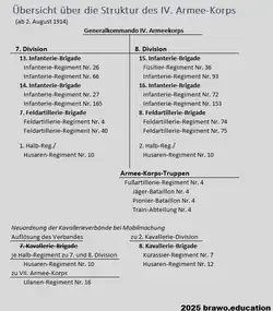 Vor Kriegsbeginn waren für das IV. Armee-Korps in den Standorten folgende Einrichtungen und Truppenteile stationiert: