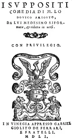 - Lodovico Ariosto: Comedie, cioè, I Suppositi, la Cassaria, la Lena, il Negromante, & la Scolastica. Venedig, Gabriel Giolito de Ferrari, 1562.