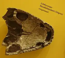 Ichthyostega (gr. ichthys „Fisch“ und stega „Dach“, „Schädel“) war einer der ersten Tetrapoden (Landwirbeltiere), der zeitweise auf dem Land leben konnte. Er war etwa 1,5 m lang. Die Zahl seiner Finger und Zehen wird heute meistens mit sieben angegeben. Der Ichthyostega-Experte Erik Jarvik war jedoch der Auffassung, dass diese Zahl auf einer Fehldeutung des fossilen Befundes beruht und hielt Ichthyostega für fünfzehig. Von den Extremitäten sind nur die Hinterfüße fossil überliefert; sie sind paddelförmig gebaut. Der Besitz der typischen Tetrapodenextremität macht Ichthyostega zu einem Amphibium; die genaue Lebensweise ist jedoch aufgrund besonderer Merkmale wie des auffällig starren Brustkorbs noch nicht geklärt.