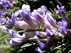 Die zwittrige Blüte ist zygomorph und fünfzählig mit doppelter Blütenhülle. Der behaarte Kelch ist urnenförmig, zweilippige, mit kurzen Kelchzipfeln. Die lilafarbene Blütenkrone hat die typische Form von Schmetterlingsblüten. Die zehn Staubblätter sind einbrüderig verwachsen. Das einzige oberständige Fruchtblatt ist fein behaart. Der Griffel ist kahl.