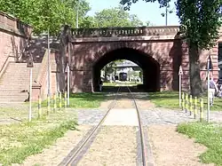 1881 verkehrte erstmals eine Pferdebahn der Frankfurter Trambahn-Gesellschaft über die Brücke. 1900 wurde die Strecke elektrifiziert.