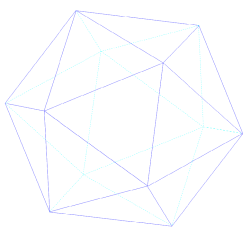 Ein Ikosaeder wird zu einem Ikosaederstumpf.Entstehung eines Ikosaederstumpfes durch Beschneiden eines Ikosaeders (jede Kante wird um 2/3 gekürzt)Ein Ikosaederstumpf besteht aus 20 Sechs- und 12 Fünfecken.Zur Berechnung von Eigenschaften, oben Ikosaeder, lila: Sechseck, rot: FünfeckDrahtgittermodell eines Ikosaederstumpfs
