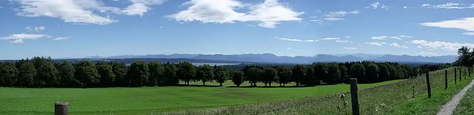 | Blick von der Ilkahöhe über den Starnberger See zu den Alpen | ||