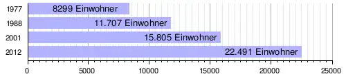 Im Stadtgebiet ohne den ländlichen Siedlungen lebten bei der Volkszählung 2012 22.491 Einwohner in 3740 Haushalten,[2] bei der Volkszählung 2001 15.805 in 2705 Haushalten[14] und bei der Volkszählung 1988 11.707 in 2043 Haushalten.[15] Bei der Volkszählung 1977 waren es 8299 Einwohner.[16]