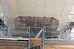 Nachdem etwa 280 m des vom südlichen Widerlager eingeschobenen Überbaus hergestellt waren, wurden die Bauarbeiten am Überbau aufgrund eines abgeplatzten Betonstückes der Bodenplatte mit der Größe von etwa 5 mal 8 m am 15. März 2010 eingestellt.[17][18] Rund 27 cm der etwa doppelt so starken Platte waren abgeplatzt.[19]