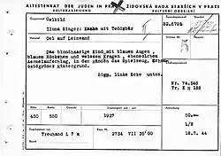 Drei Ölgemälde der Künstlerin, die sich im Besitz ihrer Schwester Margit Hahn (1902–1944)[21] befanden, wurden nach der Deportation von Margit und ihrem Sohn Jan (1926–1944)[22] konfisziert und der Treuhandstelle Prag als zentraler Sammelstelle für beschlagnahmtes Eigentum jüdischer Bürger zugeleitet.[23] Von zwei Bildern haben sich die dazugehörigen Karteikarten der Kulturabteilung des Ältestenrats der Juden in Prag erhalten. Es handelt sich einerseits um das Ölgemälde Kind mit Teddybär (hier bezeichnet als Knabe mit Teddybär) aus dem Jahre 1927 und um das 1928 entstandene Werk Bildnis Robert von Mendelssohn (hier bezeichnet als Junger Mann in braunem Anzug).