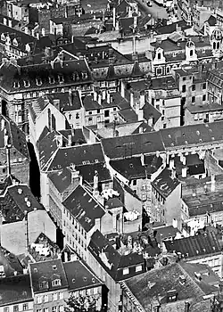 Am unteren Bildrand beginnt die damalige Franziskanerstraße mit der Einmündung in die Dreiengelstraße und verläuft dann in nördlicher Richtung nach links oben. Sie passiert die von rechts einmündende Bandstraße und erreicht links oben die Kreuzung mit der Schrotdorfer Straße. Der weitere Verlauf bis zur Braunehirschstraße ist nicht im Bild.