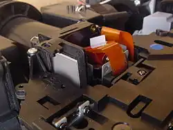 Als Ausführungsbeispiel ist hier das sogenannte lighthouse oder lightengine eines handelsüblichen LCD-Projektors abgebildet, indem sich drei LCDs als Bildgeber um einen sogenannten Prismencube gruppieren. Die drei nötigen Polarisatoren befinden sich in einem Schacht von ca. 10 mm Breite auf transparenten Trägerplatten mit Halterahmen, die beidseitig wie in der obigen Zeichnung luftgekühlt sind und so thermisch vom LCD isoliert gehalten werden. Einer der drei Polarisatoren ist zur besseren Sichtbarmachung mit seinem Rahmen nach oben aus dem Schacht gezogen worden und mit einem Stück weißem Papier hinterlegt.