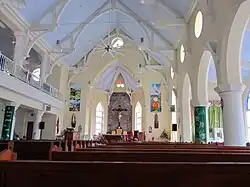 Das dreischiffige Kirchengebäude ist verhältnismäßig schlicht gehalten. Die Mauern bestehen aus bräunlich-grauem Lavagestein. Das Innere ist cremefarben gehalten, die Dachuntersicht ist in hellblau gehalten. Das Kruzifix vor der unverputzten Stirnwand im Chor bestimmt die Kirche. Eine Besonderheit ist ein begehbares Taufbecken.