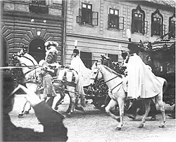 - ↑ Galawagen während einer Hoftrauer, sogenannter "Trauer-Huldigungswagen". Wagenburg, archiviert vom (nicht mehr online verfügbar) am 30. März 2010; abgerufen am 28. Juli 2010 (Inv. Nr. WGBG_W_2). Info: Der Archivlink wurde automatisch eingesetzt und noch nicht geprüft. Bitte prüfe Original- und Archivlink gemäß Anleitung und entferne dann diesen Hinweis.