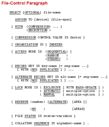 - RECORD KEY IS key-name [= seg-name ...] [ WITH [NO] DUPLICATES ]] ...: Der (primäre) Schlüssel kann aus mehreren Segmenten, d. h. einzelnen Feldern des Datensatzes bestehen, doppelte Schlüssel können erlaubt sein. Die Felder, von denen auch nur Teile als (Teil-)Index verwendet werden können, sind – wie in COBOL üblich – in der FILE DESCRIPTION zu definieren.