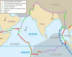 Die Indische Platte ist im Indischen Ozean von einer divergenten Plattengrenze (auseinanderstrebend) umgeben, gegenüber der afrikanischen Platte ist das der nördliche Teil des Zentralindischen Rückens, der auch als Nordwest-Indischer Rücken oder auch Carlsbergrücken bekannt ist.